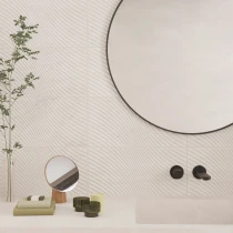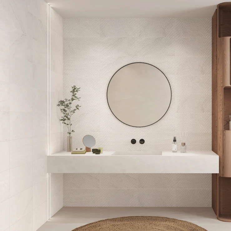 Avalun er en elegant flisekollektion i formatet 25x50 cm, der kombinerer rene overflader med diskrete reliefdetaljer. Den matte finish sammen med de strukturerede dekorfliser skaber et blødt lysspil og giver væggen et levende, sofistikeret udtryk.