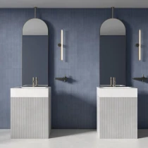 Delicate är en kollektion som tolkar betong på ett elegant och harmoniskt sätt. Den matta ytan med subtila färgskiftningar för tankarna till handstänkt cement med mjuka rörelser och naturligt djup - ett uttryck som passar lika bra i moderna badrum som i kök, vardagsrum, butiksmiljöer och spa.