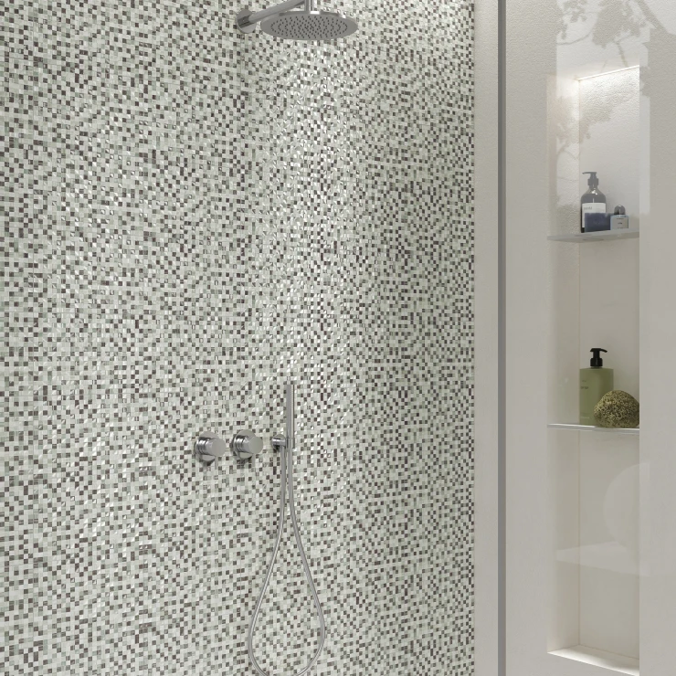 Ljusvik er en stilfuld mosaikkollektion til væg i formatet 25x50 cm, hvor små glasstykker sammen skaber en levende og dynamisk overflade. Den tætte mosaikstruktur giver en subtil dybde og et smukt lysspil, der ændrer sig afhængigt af lys og vinkel, hvilket tilfører rummet en eksklusiv og sofistikeret følelse.