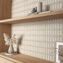 Kollektionen kompletteras av dekorkakel för vägg, som finns i två utföranden. Det ena består av ett smalt hexagonmönster med ett stilrent och grafiskt uttryck. Det andra utförandet kombinerar samma smala hexagonform med en effekt som ger intrycket av växtlighet bakom glas, som om en stillsam trädgård döljer sig bakom väggen. Detta skapar ett djup och en levande känsla som tillför rummet karaktär och atmosfär.