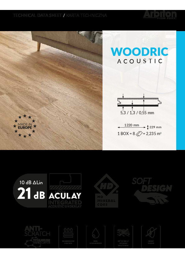Woodric är uppbyggt med HD Mineral Core®, vilket ger hög dimensionsstabilitet och minimal rörelse i golvet. Med en total tjocklek på 5,3 mm och ett slitlager på 0,55 mm är golvet konstruerat för lång livslängd och daglig användning.