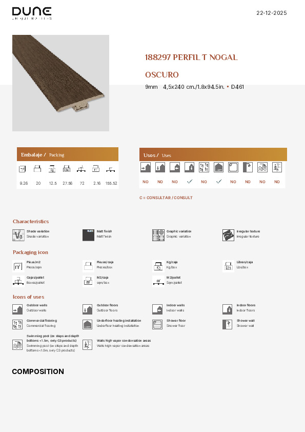 Varje planka är konstruerad med ett avancerat slitlager, en rik valnötsinspirerad dekorativ film och EIR-teknik (Embossed in Register) som anpassar ytstrukturen till träets ådring och kvistar. Detta resulterar i en mycket realistisk taktil och visuell upplevelse.