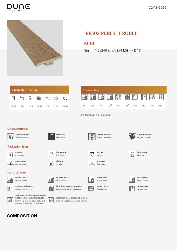 ROBLE-serien inkluderar även matchande T-formade profiler utformade för sömlösa övergångar mellan rum eller olika golvytor, vilket säkerställer en enhetlig och professionell finish.