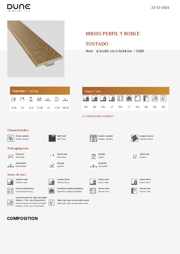ROBLE-serien inkluderar även matchande T-formade profiler utformade för sömlösa övergångar mellan rum eller olika golvytor, vilket säkerställer en enhetlig och professionell finish.