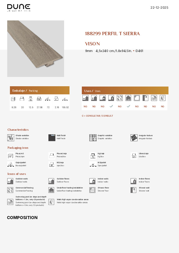 Tack vare sin vattentäta konstruktion är SIERRA lämpligt för badrumsgolv och fuktutsatta områden, men det är inte avsett för användning inomhus i duschområden eller zoner med permanent vattenexponering.