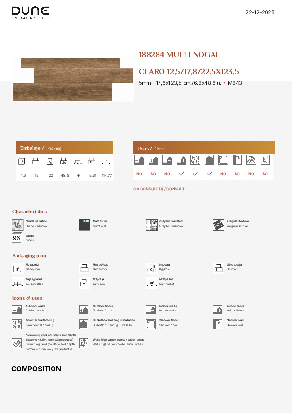 Tack vare sin vattentäta konstruktion är MULTI NOGAL lämplig för badrumsgolv och fuktutsatta områden, men den är inte avsedd för användning inomhus i duschområden eller zoner med permanent vattenexponering.
