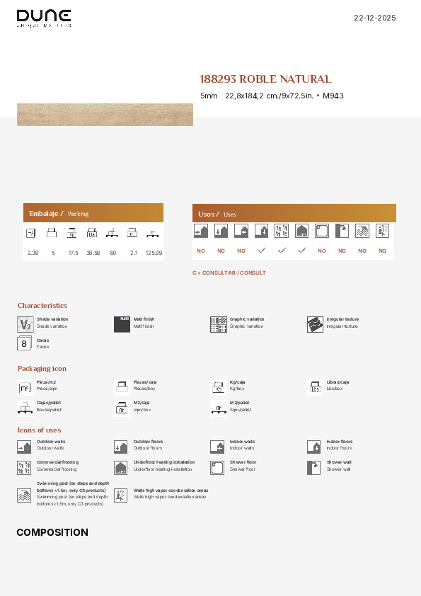ROBLE är en premiumkollektion av SPC-golv utvecklad för interiörer som eftersträvar det mest autentiska trägolvsutseendet möjligt. Den matta finishen ger ett raffinerat och modernt utseende och erbjuder en harmonisk balans mellan elegans och vardaglig funktionalitet. Plankformatet 23x184.2 cm framhäver den naturliga ekdesignen, medan den djupa strukturen och EIR-präglad yta följer träets ådring med imponerande precision. Kollektionen finns i fyra eleganta nyanser inspirerade av europeisk ek.