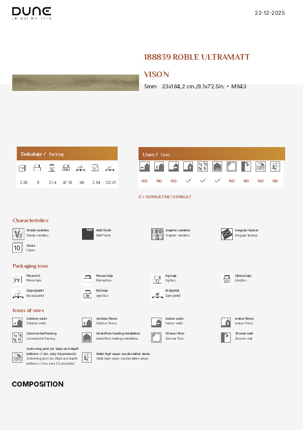 Kollektionen är klassad som 23/33, vilket innebär att den är lämplig för intensivt hemmabruk såsom hallar, kök och vardagsrum, samt för kommersiella miljöer med högt slitage, såsom butiker, kontor och hotellmiljöer.