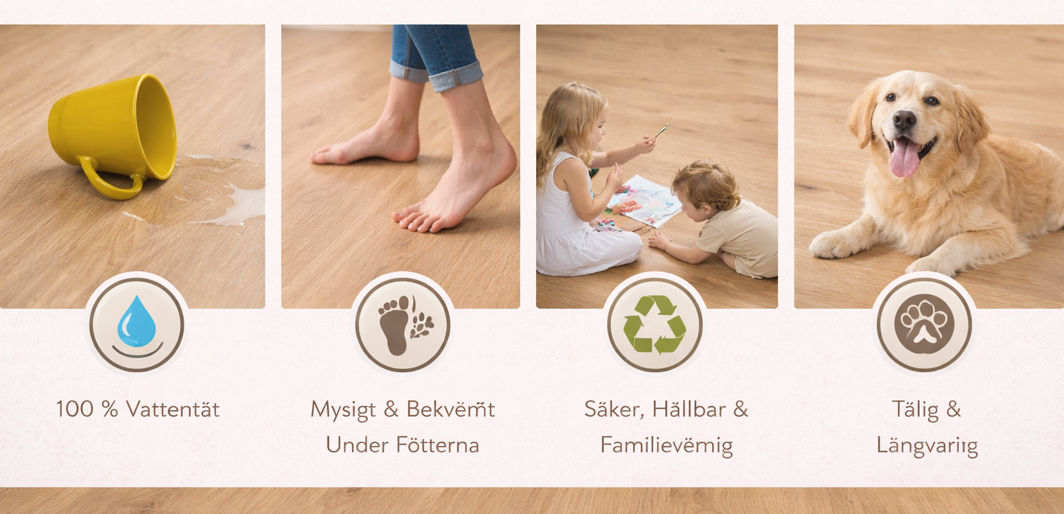 Kollektionen inkluderar ett mycket slitstarkt slitlager, en djupt texturerad dekorativ film som naturtrogent återger ekens ådring och en robust SPC-kärna konstruerad för stabilitet och styrka. Golvet är utformat för att tåla daglig användning och erbjuder reptålighet, UV-skydd, antibakteriella egenskaper och är husdjursvänligt.