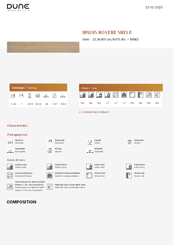 ROVERE finns i två format för att passa olika rumsliga behov. Plankan 22,8x180 cm ger en stark visuell närvaro och en känsla av rymd, perfekt för större rum och öppna planlösningar. Formatet 22,8x152,4 cm erbjuder en mer hanterbar storlek, perfekt för mindre rum eller installationer som kräver större flexibilitet samtidigt som samma eleganta estetik bibehålls.