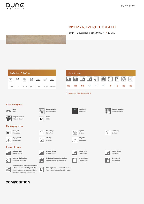 ROVERE finns i två format för att passa olika rumsliga behov. Plankan 22,8x180 cm ger en stark visuell närvaro och en känsla av rymd, perfekt för större rum och öppna planlösningar. Formatet 22,8x152,4 cm erbjuder en mer hanterbar storlek, perfekt för mindre rum eller installationer som kräver större flexibilitet samtidigt som samma eleganta estetik bibehålls.
