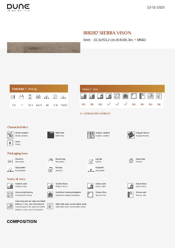 Tack vare sin vattentäta konstruktion är SIERRA lämpligt för badrumsgolv och fuktutsatta områden, men det är inte avsett för användning inomhus i duschområden eller zoner med permanent vattenexponering.