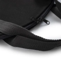 • Väskan har ergonomiska bärremmar i förstärkt bomullsband, en framsida i naturläder med ficka för extra förvaring och en industriklassad dragkedja som tål tuff användning. Färg: svart med kolgrå remmar.
