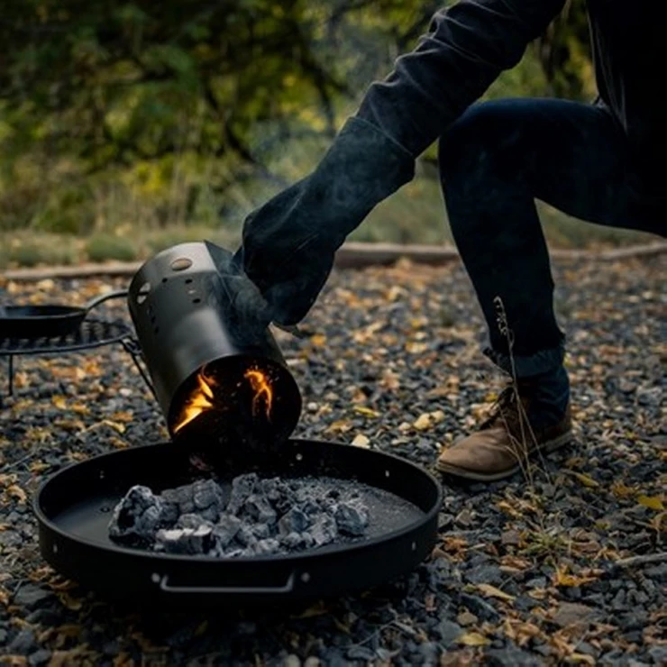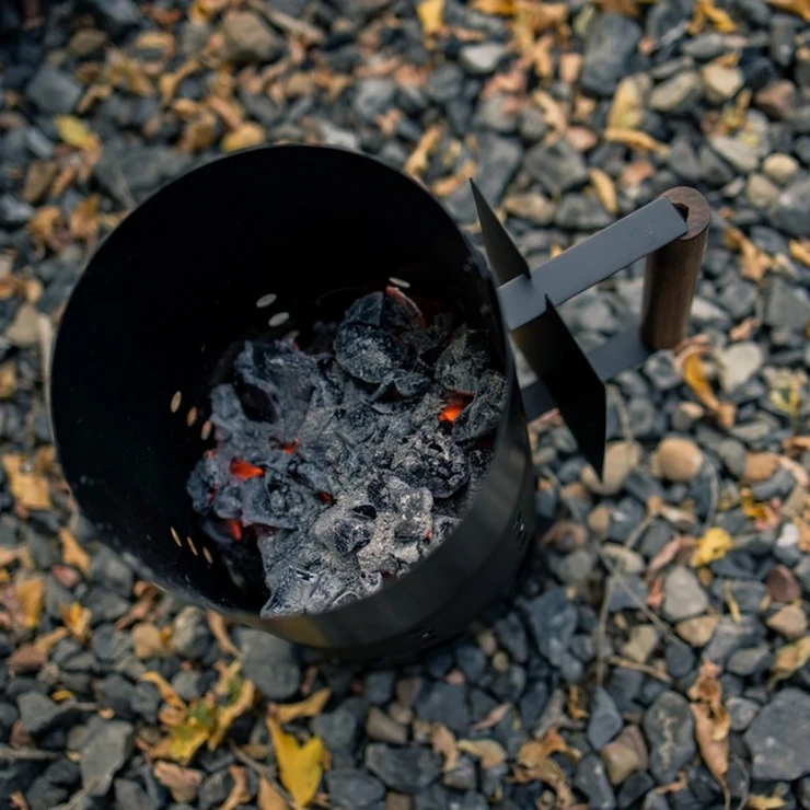 • Fyll startaren med briketter och tänd kolet genom ventilationshålen. Kolet antänds jämnt tack vare den slutna konstruktionen, och när kanterna blivit vita är de redo att hällas ut i eldstaden. Denna metod ger en stabil och långvarig värmekälla – perfekt för grillning och matlagning över öppen eld.