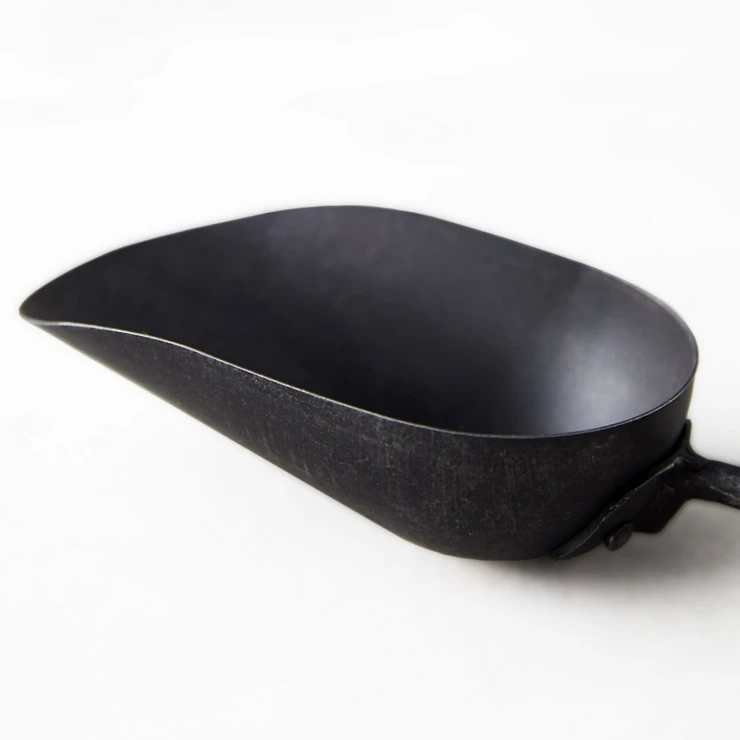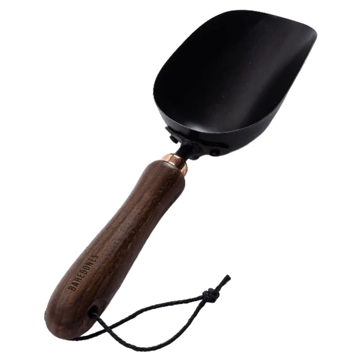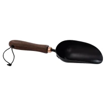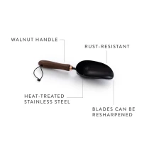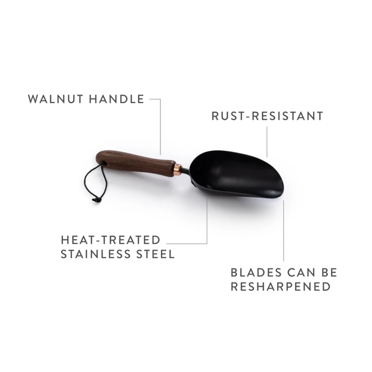 • Skopan är tillverkad med ett ergonomiskt handtag i valnöt eller ask och ett rostbeständigt, värmebehandlat blad i rostfritt stål med eleganta koppardetaljer. Den höga, kupade formen förhindrar spill och gör arbetet snabbt och precist. Byggd för komfort, balans och lång livslängd.