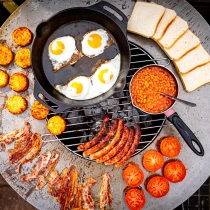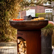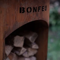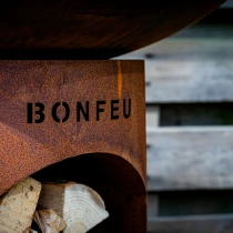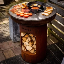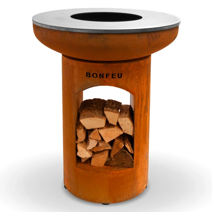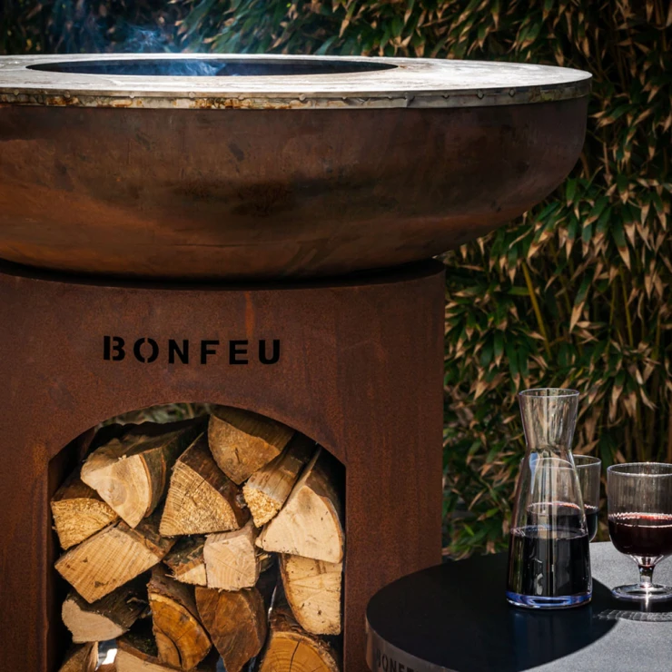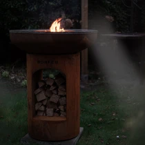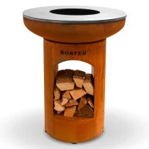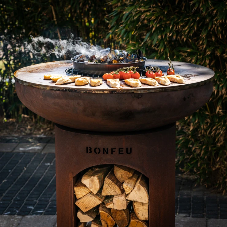 Till skillnad från standardmodellen har BonBiza Öppen praktisk vedförvaring i basen, vilket gör det enkelt att fylla på ved under matlagningen. Produkten fungerar både som värmekälla och matlagningsstation – perfekt för långa kvällar med mat och gemenskap.