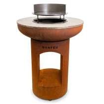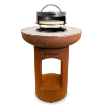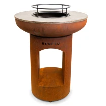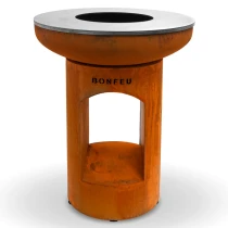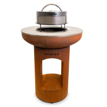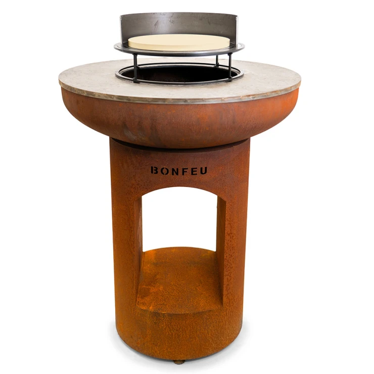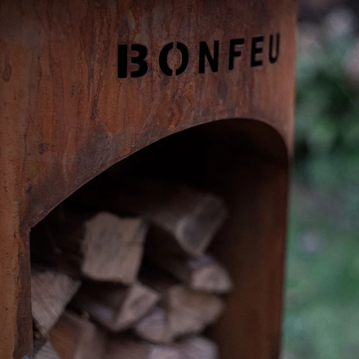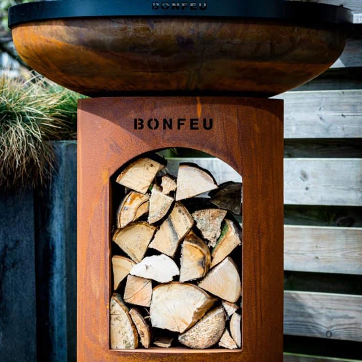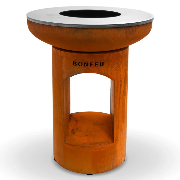 1. BonBiza Eldstad Öppen Cortenstål: BonBiza Öppen är flaggskeppet i BonFeu-kollektionen och ett komplett utomhuskök för plancha-matlagning och eldmys. Tillverkad av 2–3 mm tjockt cortenstål som utvecklar en naturlig rostpatina över tid. Den täta oxidhinnan skyddar materialet och gör eldstaden väderbeständig och frosttålig.