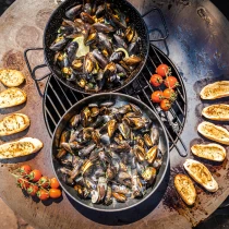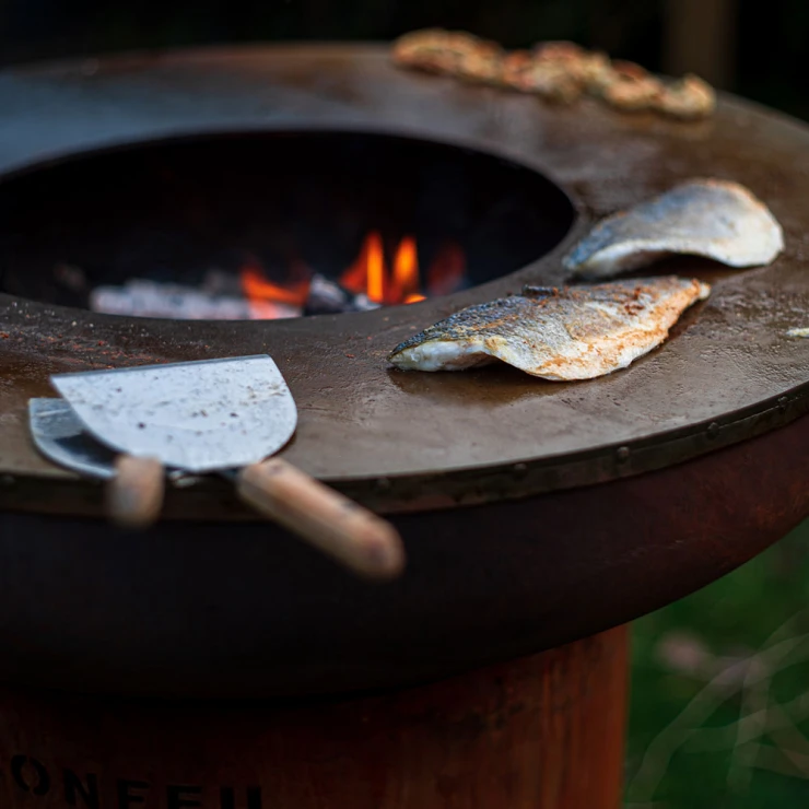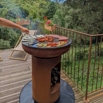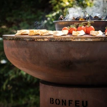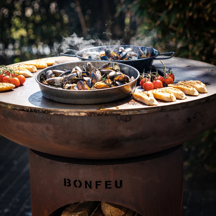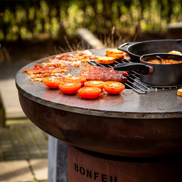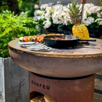 Plancha-information: BonBiza är särskilt speciell eftersom du inte bara kan njuta av en mysig eld utan även laga mat direkt på planchan. Planchan har en diameter på 80 cm, är 6 mm tjock och ger en generös stek- och bakyta. Värmen sprids gradvis från mitten mot kanterna, vilket skapar flera värmezoner och gör det möjligt att tillaga flera rätter samtidigt.