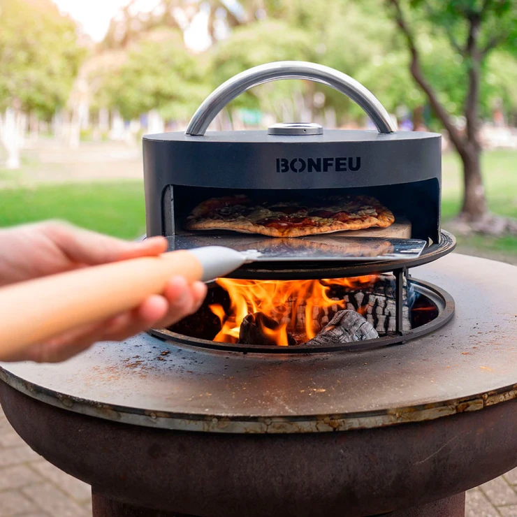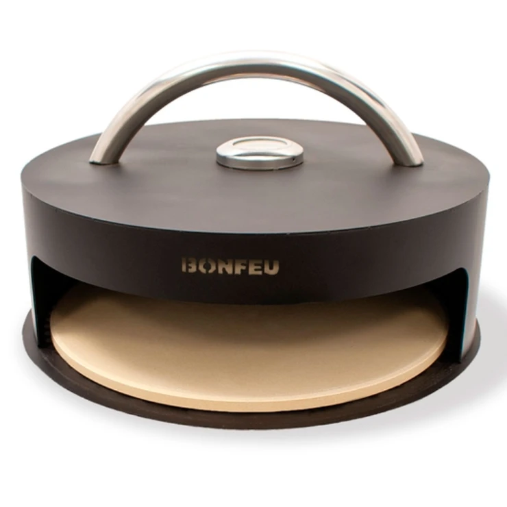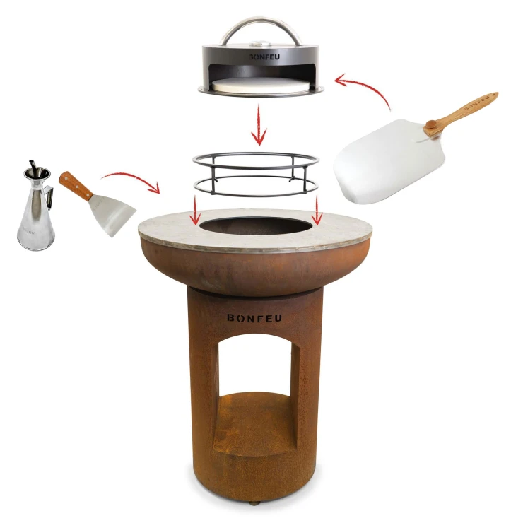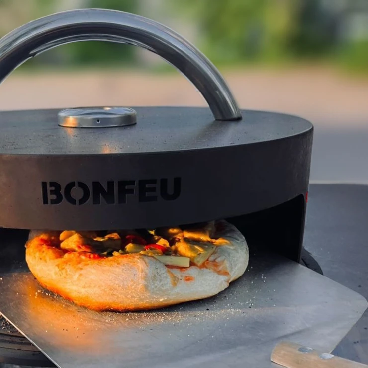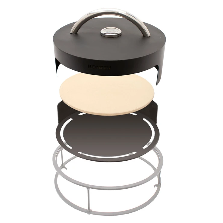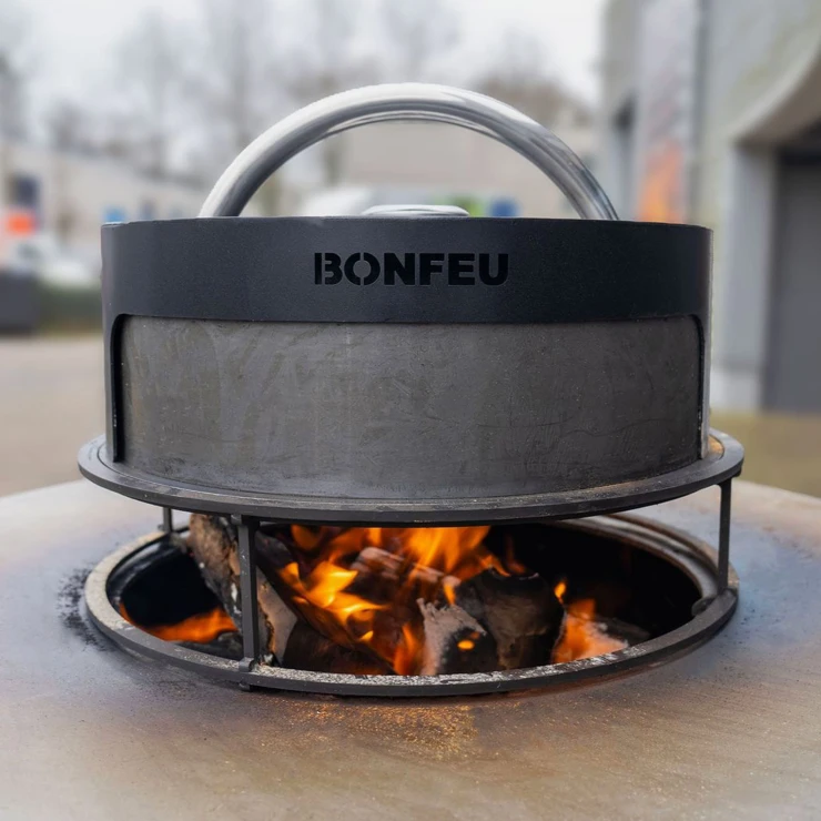 3. Pizzaugn (BonPizza): BonFeu BonPizza är en vedeldad pizzaugn i kolstål som placeras ovanpå Subbel-stativet. Ugnen består av en basplatta, pizzasten och lock med stort, värmeisolerat handtag. Den ger jämn värmefördelning och klarar temperaturer upp till 300 °C.