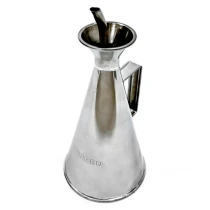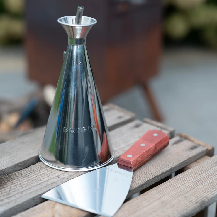 4. Oljekanna: Den stilrena BonFeu-oljekannan i rostfritt stål är idealisk för att dosera olja på planchan. Tack vare ventilationshålen i locket kan oljan appliceras jämnt och kontrollerat. Oljekannan tål värme och kan stå direkt på den varma matplattan.