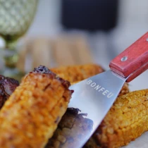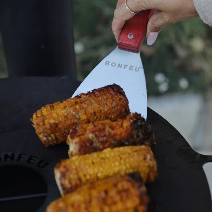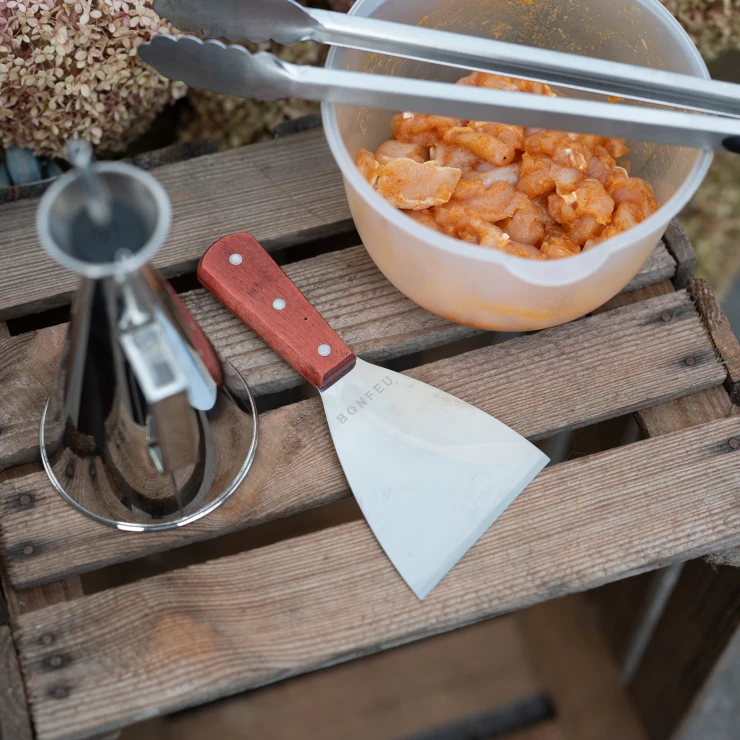 5. Stekspade: BonFeu Stekspade är ett oumbärligt redskap för plancha-matlagning. Bladet i rostfritt stål har en vass kant som gör det enkelt att vända, lossa och hantera maten samt rengöra planchan från matrester och överflödigt fett. Trähandtaget ger ett säkert och bekvämt grepp.