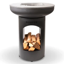 BonBiza Öppen Svart är den klassiska BonFeu-designen i en modern svart finish – ett komplett utomhuskök som kombinerar grillning och plancha-matlagning i ett. Tillverkad av slitstarkt kolstål erbjuder den både hållbarhet och tidlös estetik. Den integrerade vedförvaringen i basen gör det enkelt att lägga till ved under tillagningen och skapar samtidigt en praktisk, enhetlig design.