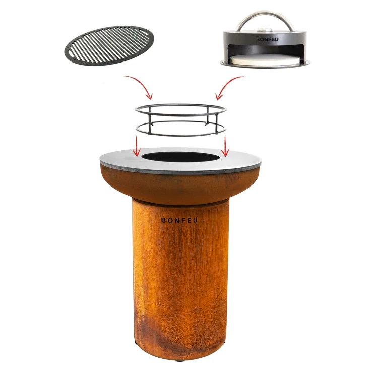 BonFeu Sæt med BonBiza Ildsted Cortenstål, Dobbelt Stålring til Grill, Rundt Grillrist & Pizzaovn