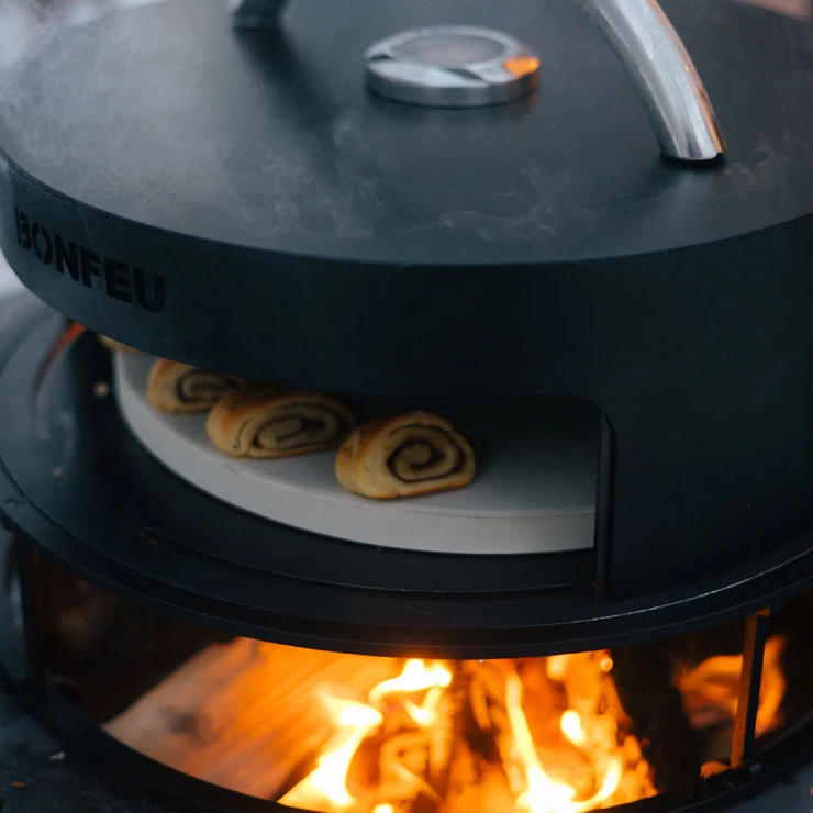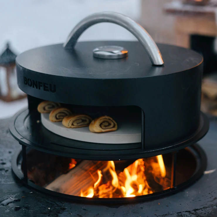 BonFeu BonPizza är en mångsidig pizzaugn i kolstål som gör det möjligt att baka autentiska, vedeldade pizzor direkt på din BonBiza. Den placeras ovanpå Subbel-stativet och ger jämn värmefördelning för krispiga pizzor med perfekt tillagad botten. Ugnen består av en stabil basplatta, en högkvalitativ pizzasten och ett välvt lock med inbyggd termometer och ett svalt handtag för säker hantering. Med en diameter på Ø42 cm är den kompakt men rymlig nog för att baka pizzor i restaurangkvalitet.