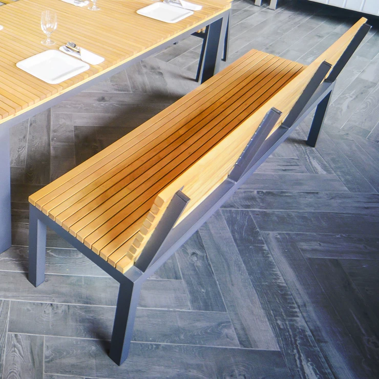 Bordet på 160 cm erbjuder generös utrymme för servering, måltider och sociala stunder. Bänkarna ger flexibel och platsbesparande sittplats, perfekt för större grupper.