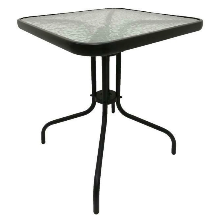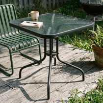 Bordpladen er fremstillet af holdbart hærdet glas med et dekorativt bølgemønster, der giver bordet et unikt og æstetisk udtryk. Konstruktionen i pulverlakeret stål giver stabilitet og god modstandsdygtighed mod vejrpåvirkninger, hvilket gør bordet egnet til både udendørs og indendørs brug.