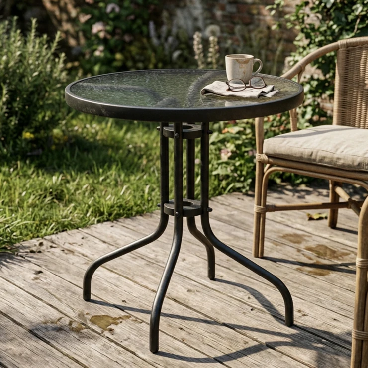 Bordet har en rund glasplade i hærdet glas med et dekorativt bølgemønster, der reflekterer lyset og giver en moderne følelse. Den pulverlakerede stålramme sikrer stabilitet og god holdbarhed, samtidig med at den beskytter mod ydre påvirkninger.