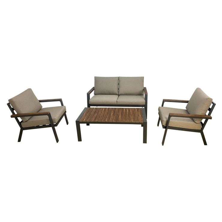 Den generøse sofa, to lænestole og et rummeligt bord gør sættet ideelt både til daglig afslapning og til at være sammen med familie og venner. Den neutrale taupefarve gør, at sættet nemt kan kombineres med forskellige stilarter og udendørsmiljøer.