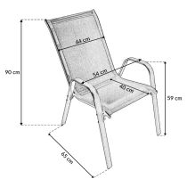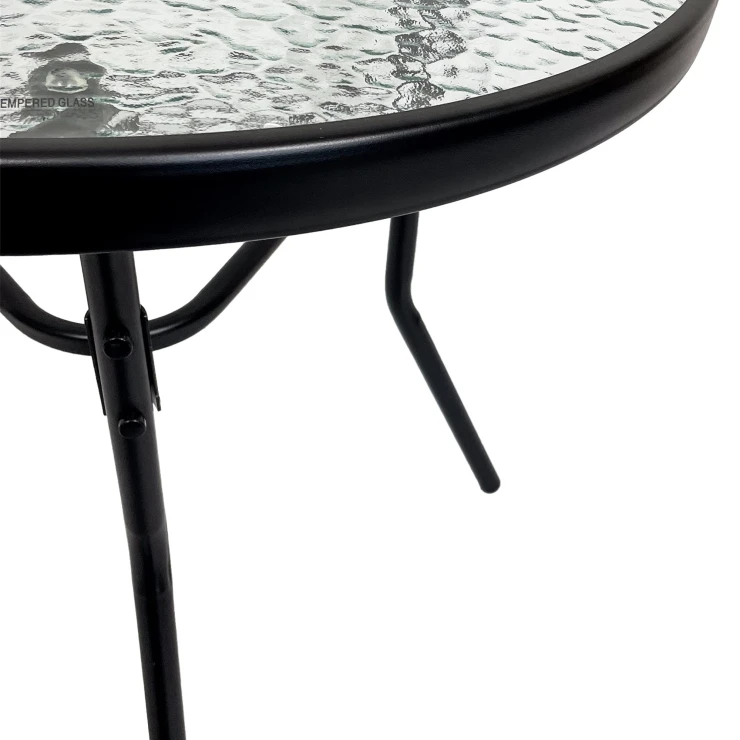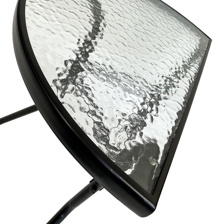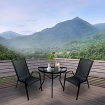 Møblerne er fremstillet af slidstærke materialer som pulverlakeret stål og textilene, hvilket giver god holdbarhed og vejrbestandighed. Bordpladen i hærdet glas er både praktisk og let at rengøre.