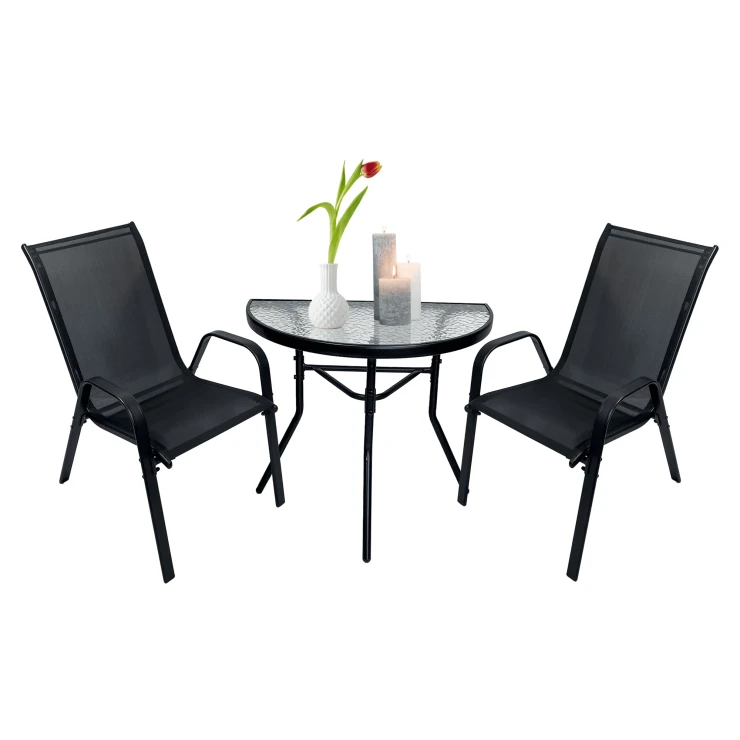 Havesæt med Halvrundt Bord & 2 Stole med Armlæn Norby Sort er et kompakt og funktionelt møbelsæt, der passer perfekt til altan, terrasse, udestue eller mindre haver. Sættet skaber et behageligt sted til måltider eller afslapning udendørs.