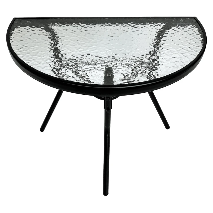 Den halvrunde form på bordet gør det nemt at placere mod en væg og spare plads, hvilket gør det særligt velegnet til mindre områder. Stolene med armlæn giver ekstra komfort og stabilitet ved brug.