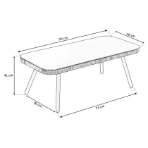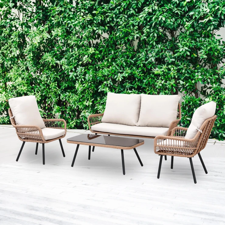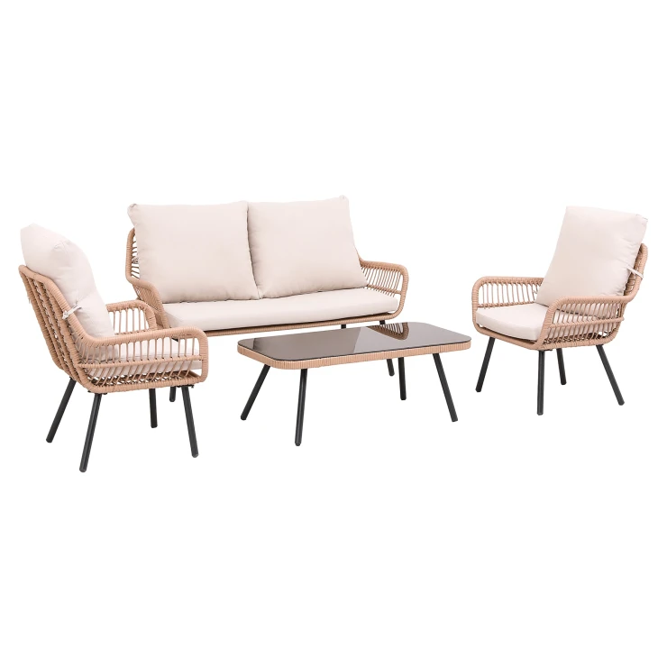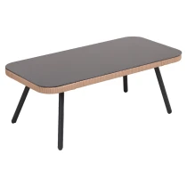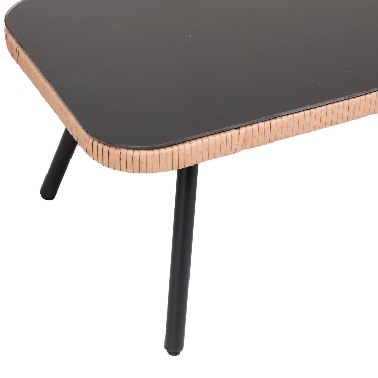 Møblerne er fremstillet af slidstærk polyrattan kombineret med en stabil pulverlakeret stålramme, hvilket giver god holdbarhed og modstandsdygtighed mod daglig brug. Bordet er udstyret med en plade i hærdet glas, der er let at rengøre og praktisk ved servering.