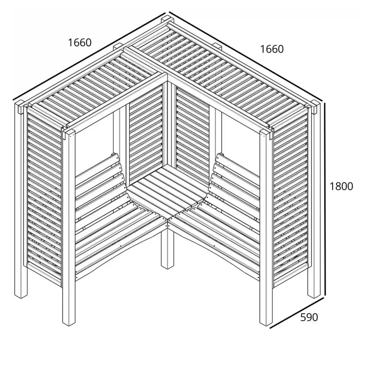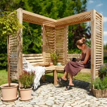• Pergola med Bänk Moreton är en modern och funktionell hörnpergola som skapar en mysig plats för avkoppling utomhus. Den minimalistiska designen med horisontella ribbor följer de senaste trädgårdstrenderna och blir ett stilfullt inslag i både trädgård och på uteplats.