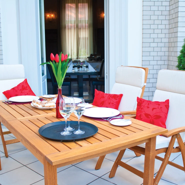 Kombinera stolar och bord från Viney för att skapa en harmonisk och funktionell matgrupp anpassad för din utomhusmiljö.