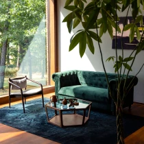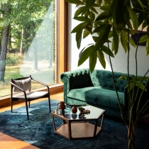 Design med böljande linjer och rundade hörn, blandat med rena, robusta material i djupa, varma nyanser. Föreställ dig olika träslag i alla nyanser, stål med antik finish och glas i olika former, samt rikliga tyger som sammet, mocka och fina vävda material.