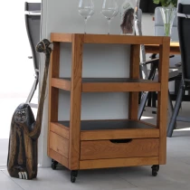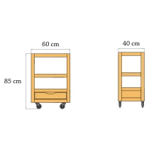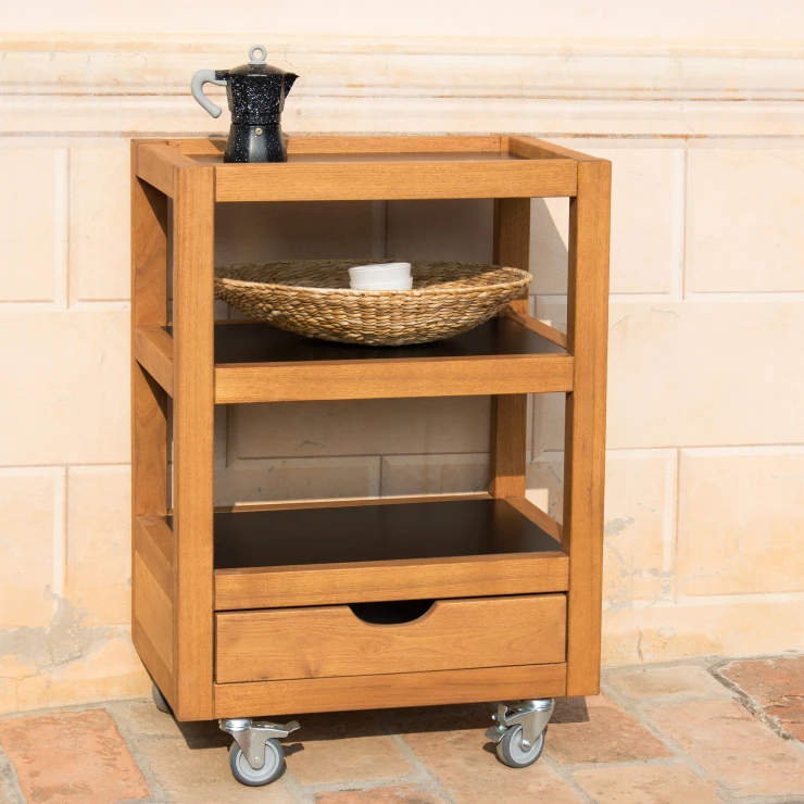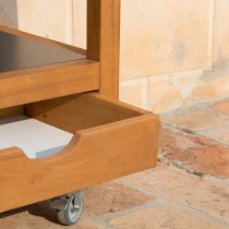 • Rullbord Maple är ett kompakt och funktionellt avlastningsbord för utomhusmiljöer. Det passar perfekt som serveringsbord vid grillen, som hjälpreda på terrassen eller som flexibel förvaringsmöbel i trädgården. Med två öppna hyllor och en praktisk utdragslåda får du gott om plats för redskap, tillbehör och mindre föremål.