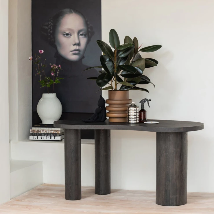 • Tidlös enkelhet: det är vad du tar in i ditt hem med detta organiska sidobord/skrivbord från Moon. Sidobordet/skrivbordet Moon är tillverkat av MDF och har en bordsskiva med 3D-papper. Den mörkbruna finishen med klara träådringar ger bordet ett varmt utseende och passar bra in i en botanisk, retro- eller bohemisk inredning.