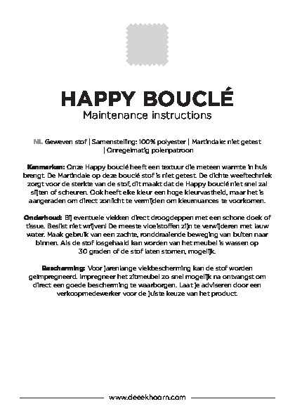 Vår Happy bouclé har en textur som ger omedelbar värme till hemmet. Martindale-tyget på detta bouclétyg har inte testats. Den täta väven säkerställer tygets styrka, vilket gör att Happy bouclé osannolikt slits eller går sönder. Dessutom har varje färg hög färgbeständighet, men det rekommenderas att undvika direkt solljus för att undvika färgnyanser.
