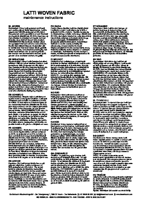 Vårt vävda Latti-tyg har ett mjukt grepp och en ljus nyans. Latti består av 94 % polyester och 6 % nylon. Det vävda tyget är lämpligt för intensiv användning i bostäder (Martindale 25 000), men var försiktig med vassa föremål och husdjursklor, dessa kan orsaka öglor.