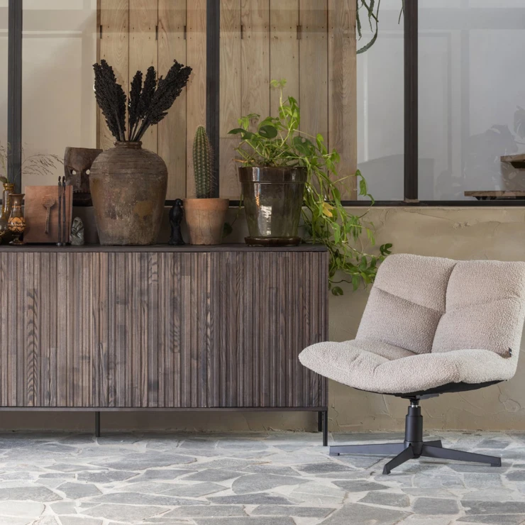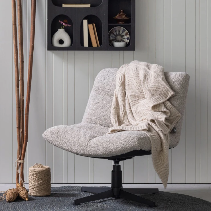 Vinny är klädd i ett supermjukt bouclétyg som heter Cres. Sammansättningen av 100 % polyester gör snurrstolen mycket lätt att underhålla. Vinny har en svart metallbas med fyra ben och ett smidigt rotationssystem. Polyuretanskumfyllningen har hög sittkomfort och är därför perfekt för en stunds njutning med en god bok!