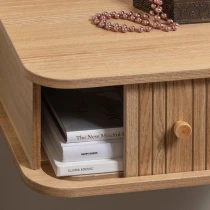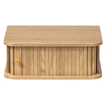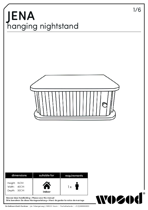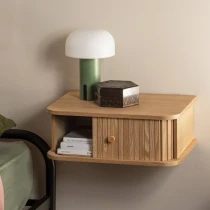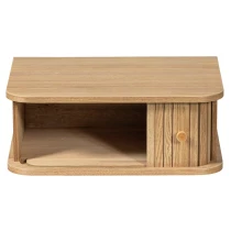 • Det hängande nattduksbordet Jena kommer från kollektionen från det holländska inredningsmärket WOOOD och är elegant med sin unika design. Skåpet är tillverkat av poppelträ och erbjuder ett varmt, naturligt utseende som smälter sömlöst in i olika inredningsstilar. Dessutom har Jena nattduksbord praktiskt förvaringsutrymme bakom den befintliga skjutdörren. Funktioner Poppelträ är känt för sina raka ådringar och jämna struktur, vilket gör det till ett särskilt attraktivt material för en mängd olika tillämpningar. Träet är ljust i färgen och har en slät yta, vilket bidrar till ett elegant utseende. Den raka ådringen skapar ett enhetligt utseende, medan den jämna texturen gör bearbetning och efterbehandling enkel.