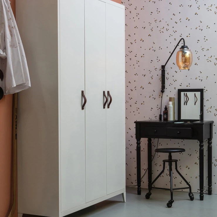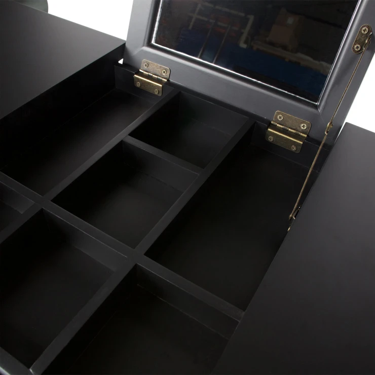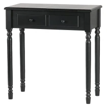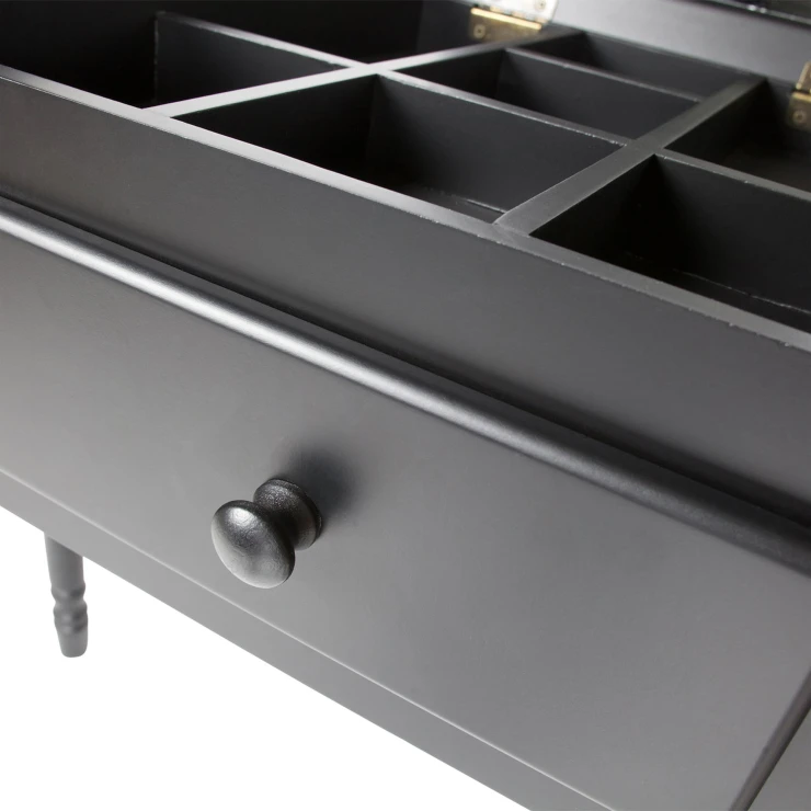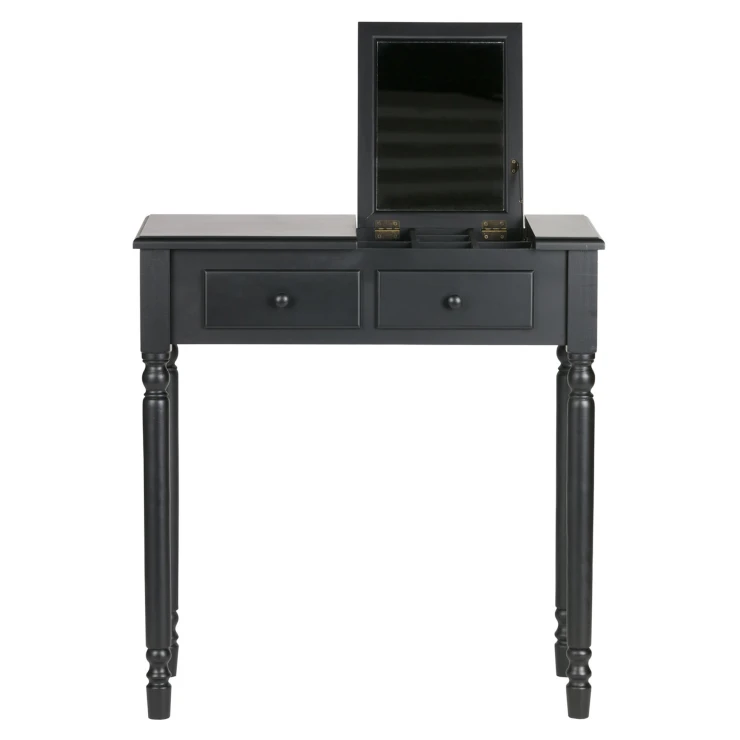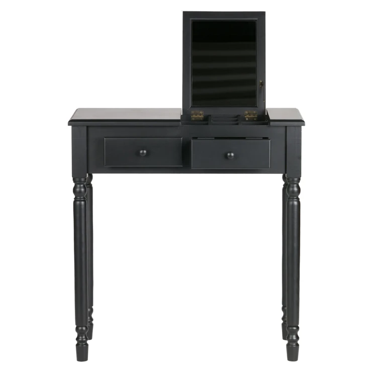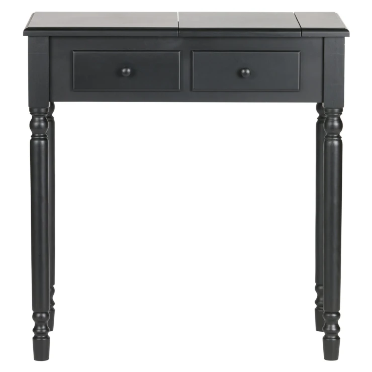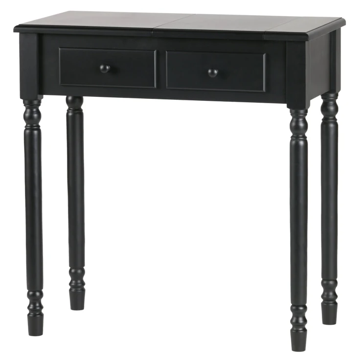 • Romy, från WOOOD-kollektionen, är ett mycket elegant hallbord eller sidobord som förvandlas till ett sminkbord på nolltid. Hallbordet Romy har en spegel gömd i toppen som du kan fälla upprätt. Under spegeln finns en dold fackavdelning för att förvara alla dina sminksaker, till exempel. Romy har också två lådor för ännu mer förvaringsutrymme. Placera en av dina vackraste accessoarer på Romy, eller en cool vas med blommor, så har du en mycket elegant helhet. Romy är tillverkad av mattsvartlackerad furu och MDF. Den är 78 cm hög, 75 cm bred och 38 cm djup. Bredden på den hopfällbara spegeln är 28 cm. Tjockleken på toppen är 2 cm. Detta hallbord står på elegant höga ben med en diameter på 5 cm, höjden till sminkbordsdelen är 60,5 cm. Lådornas fronter är vardera (hxb) 9,5x25 cm.