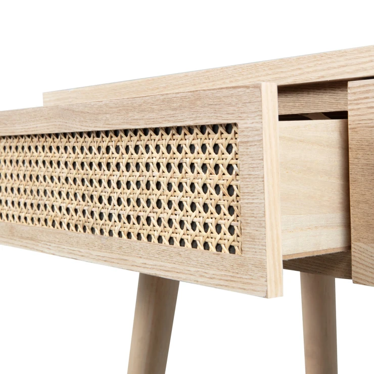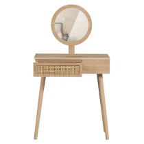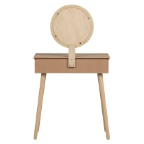 • Soof-bordet är multifunktionellt för sin praktiska enkelhet. Bordet från kollektionen från det holländska inredningsmärket WOOOD har en praktisk spegel i en elegant, minimalistisk cirkel. Den slätbehandlade furuträet i ljus färg ger en skandinavisk känsla och de två lådorna erbjuder praktiskt förvaringsutrymme för små prylar. VARNING: Tipprisk! För möbler högre än 70 cm rekommenderar vi att du är extra noggrann med väggmonteringen. Fallskyddande montering förhindrar olyckor och skyddar möblerna från att välta.