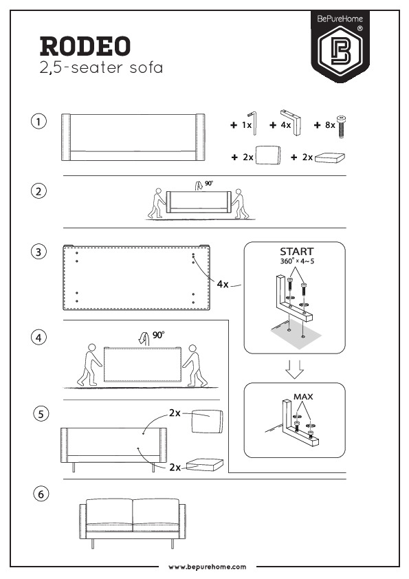 Rodeo 2,5-sitssoffan levereras i ett paket. Benen är enkla att montera med hjälp av de medföljande monteringsanvisningarna. För att skydda hårda golv, placera filtglidare på undersidan av benen.