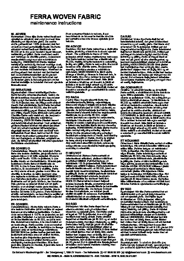 Avlägsna helt enkelt små fläckar med en fuktig trasa, dutta större fläckar med en fuktig trasa och ett neutralt möbelschampo. Om tyget kan lossna från möblerna kan det tvättas ut och in i 30 grader. För att behålla sammetsglänsen rekommenderas att borsta möblerna varje vecka med en speciell sammetsborste. Som regel rekommenderar vi inte att impregnera våra stoppade möbler. Om du dock vill göra det, testa impregneringsmedlet på en osynlig del av tyget först.