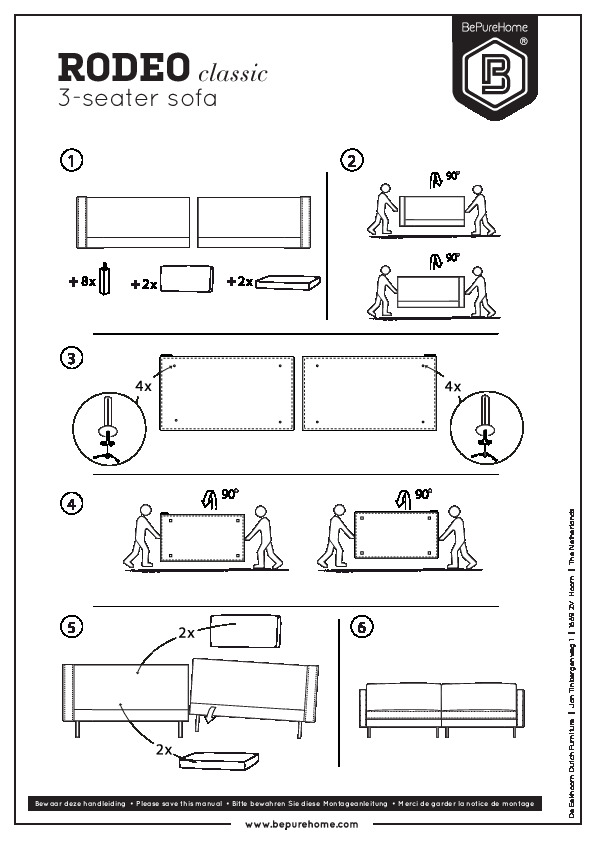 • Rodeo-serien med sittplatser från det holländska märket WOOOD är modern, tuff och samtida. Denna klassiska 3-sitsvariant har sydda sittdynor som ger soffan en klassisk touch. Soffan är generös, erbjuder gott om sittyta och har ett slitstarkt tyg i återvunnet läder. Den smala ramen och de lösa kuddarna gör att soffan ser subtil ut i vardagsrummet. De lösa kuddarna är inte vändbara. De 16 cm höga benen är tillverkade av metall med svart finish. Sitthöjden är 47 cm, sittdjupet är 58 cm, sittbredden är 251 cm, ryggstödet är 49 cm högt. Armstödens bredd är 12 cm och höjden är 70 cm. Soffans ram består av massivt trä, spånskiva, bäverpapp och kartong. Bänken har en sicksackfjädring. Sitsen har en skumfyllning T3037, ett standardskum med hög hållbarhet och bekväm sittkomfort. Ryggraden har en fyllning av 70 % skuret skum och 30 % silikon. Vad är återvunnet läder? När fabrikerna skär mönstren på skinnen blir det rester. Dessa rester krossas och vi tillverkar ett nytt tyg: Återvunnet läder. Återvunnet läder består av 70 % äkta kohud och 30 % polyester. Tyget består av två material: baslagret består av återvunnet äkta läder, vilket ger det ett naturligt och unikt utseende. Lädret skyddas av en polyesterbeläggning som förhindrar ojämnheter och gör det till ett robust kombinationstyg. Lädrets tjocklek är 0,90–0,95 mm, och polyestertygets tjocklek ovanpå är 0,25 mm. Underhåll: Det återvunna lädret kan inte behandlas med läderfett. Återvunnet läder kan underhållas enligt följande: med en fuktig trasa kan du rengöra tyget. Vid fläckar kan du använda en neutral tvållösning för att ta bort fläckarna. Torka av tyget med en fuktig trasa efter att du har tagit bort fläcken. Rodeo Classic-serien består av en 2,5-sitssoffa, denna 3-sitssoffa och en fåtölj/loveseat.